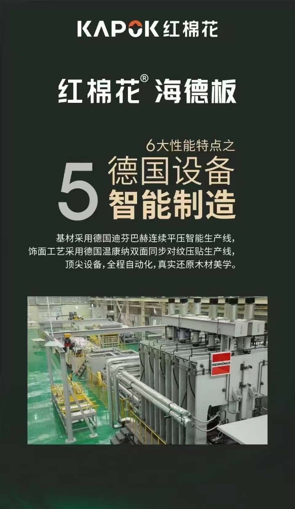 ▲紅棉花海德板使用德國(guó)迪芬巴赫連續(xù)平壓設(shè)備生產(chǎn)