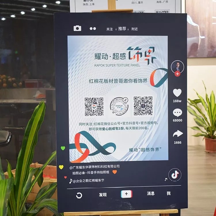 在上半年,我們開始在新媒體上持續(xù)發(fā)力,從抖音到視頻號、快手,再到小紅書,從配色方案到板材變態(tài)測試再到板材知識科普,我們不斷向大眾證明紅棉花在板材行業(yè)的領(lǐng)軍者地位。此次展會上紅棉花首次推出“紅棉花曾哥”形象,同時(shí)邀請眾多抖音網(wǎng)紅為紅棉花拍攝帶貨短視頻,“小曾哥”也在現(xiàn)場做起直播,帶領(lǐng)網(wǎng)紅們探展的同時(shí)還持續(xù)講解紅棉花的最新潮流趨勢,使得網(wǎng)紅們躍躍欲試,當(dāng)場拍攝起視頻素材。