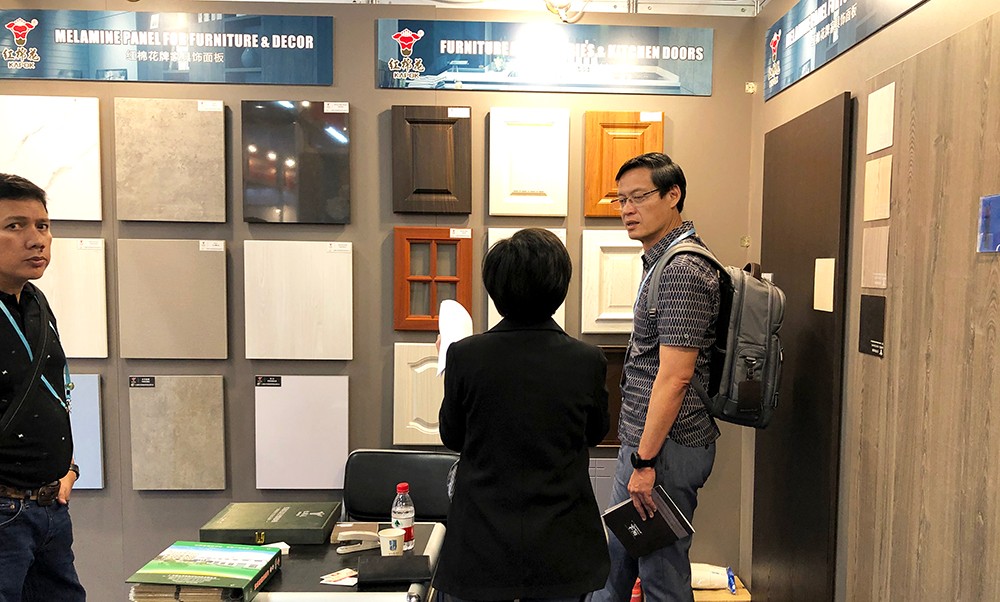 以“科技創(chuàng)新”為發(fā)展驅(qū)動的紅棉花,依托“德國設(shè)備、歐洲設(shè)計、中國智造”的核心優(yōu)勢,不斷推出高質(zhì)量、高技術(shù)、高品牌價值的環(huán)保、時尚家具飾面板。本次紅棉花板材展位共分為三大區(qū)域:同步對紋系列產(chǎn)品展示區(qū)、精品家具飾面板區(qū)、家裝建材輔料區(qū),吸引了眾多國內(nèi)外采購商前來觀摩、洽談。